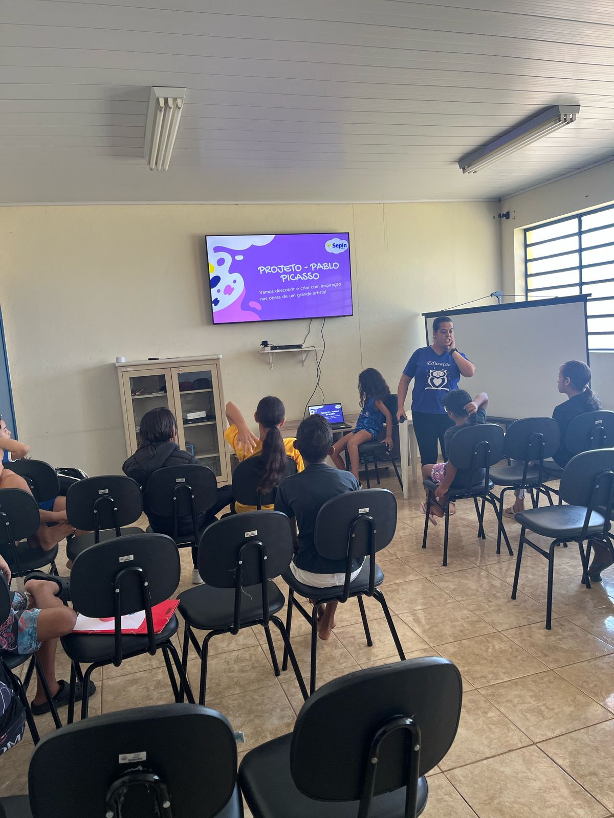 As crianças participaram do projeto “Pablo Picasso”, conhecendo a história e as técnicas de arte utilizadas pelo artista. Durante a atividade, exploraram cores, formas e expressões, desenvolvendo a criatividade e o olhar artístico.