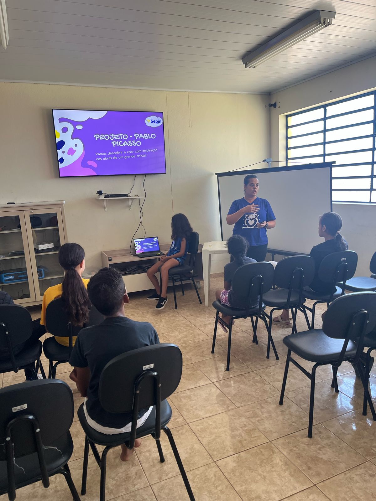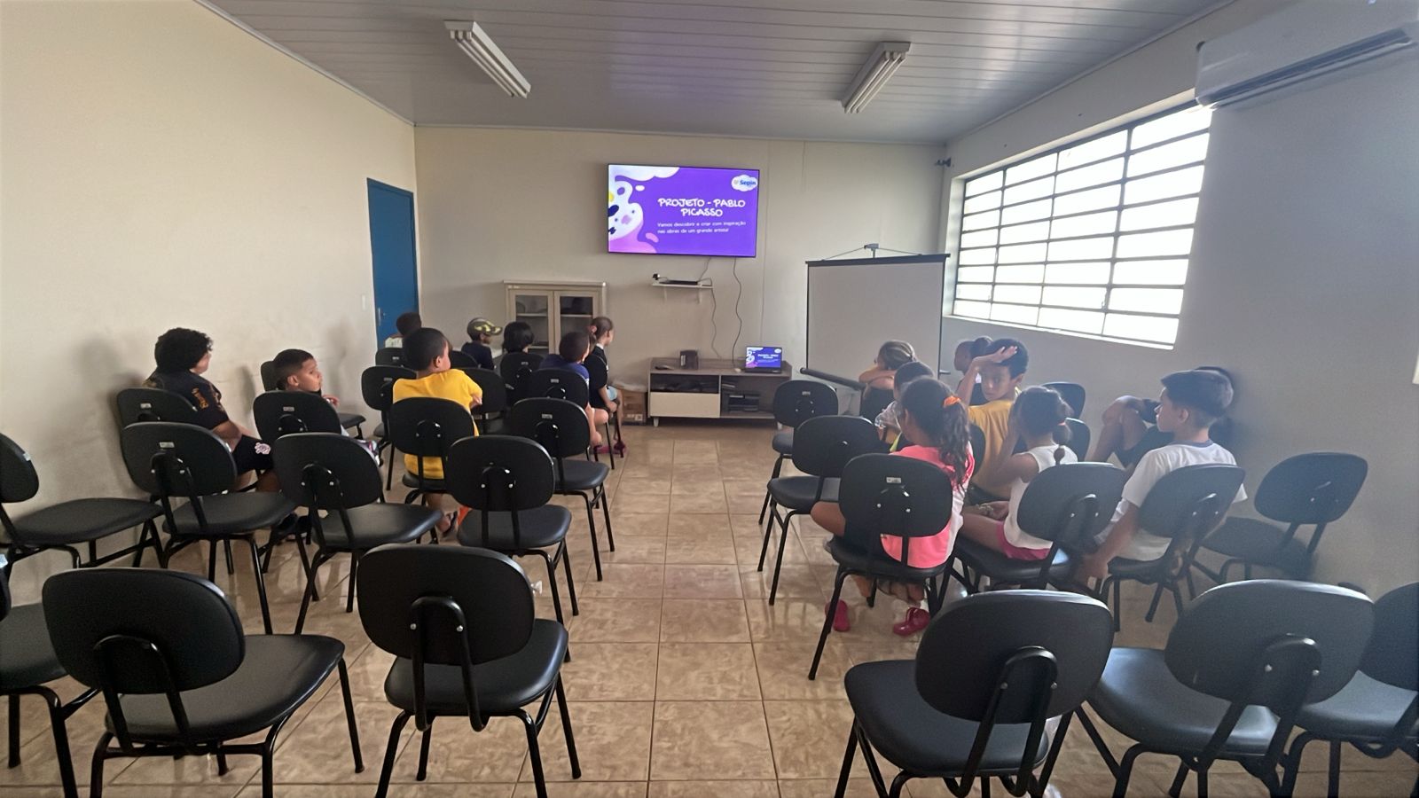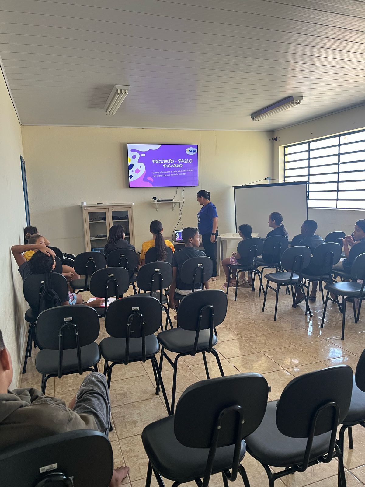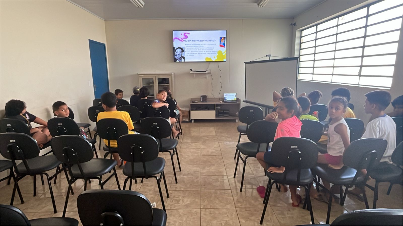 As crianças participaram do projeto “Pablo Picasso”, conhecendo a história e as técnicas de arte utilizadas pelo artista. Durante a atividade, exploraram cores, formas e expressões, desenvolvendo a criatividade e o olhar artístico.